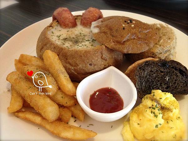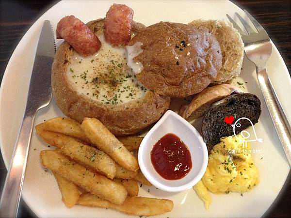 香腸、薯條、炒蛋、歐式麵包,沒有什麼奇怪的食材,但也就是那些標準的配料