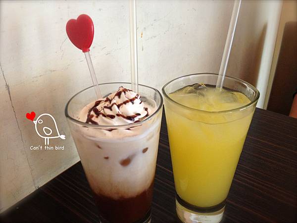 最後是附餐飲料,柳橙汁,其中一杯5折優惠加價升級成摩卡拿鐵